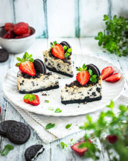 Gebackener Veganer Oreo-Cheesecake mit Erdbeeren