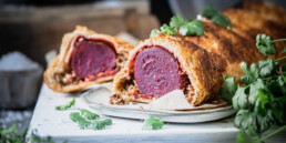 Nun die Rote Bete entlang der Mitte auf dem Blätterteig aufreihen. Den Blätterteig über die Rote Bete schlagen und die kurzen Enden vom Teig zusammenfalten.