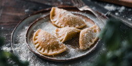 - Die Ränder mit etwas pflanzlicher Milch einpinseln. Den Blätterteig um die Füllung schließen, dabei sollte er etwas überlappen.