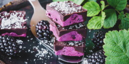 - Die übrige Schokolade ggfl. nochmals erwärmen, dann damit die Brombeermischung toppen. Optional mit Kokosflocken toppen.