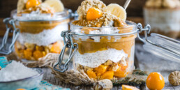 Die Physalis in zwei Gläser aufteilen, dann die Kekskrümel darüber streuen. Nun die Hälfte der Kokos-Chia-Creme in die Gläser füllen, dann die Hälfte des Erdnussmus darüber schichten. Sollte das Erdnussmus zu fest sein, vorsichtig in der Mikrowelle oder im Wasserbad schmelzen.